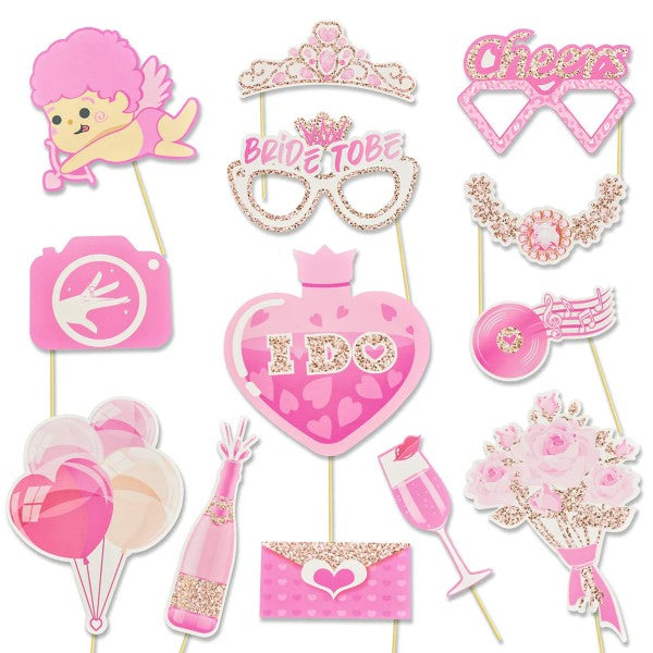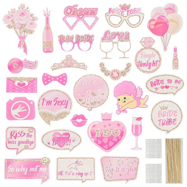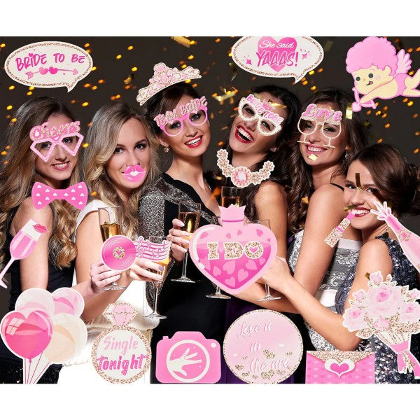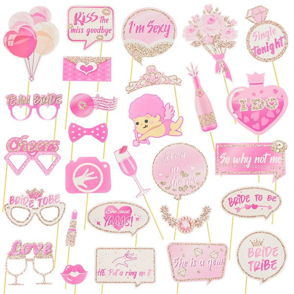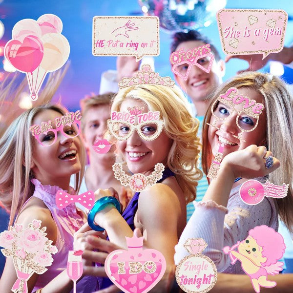 Aksesuarai ant pagaliuko fotosesijoms „Mergvakaris“ – smagus būdas sukurti nepamirštamas akimirkas! Rinkinyje net 28 linksmi elementai, tokie kaip akiniai, karūna, taurė, žiedas ir kiti, kurie papuoš jūsų šventės nuotraukas.