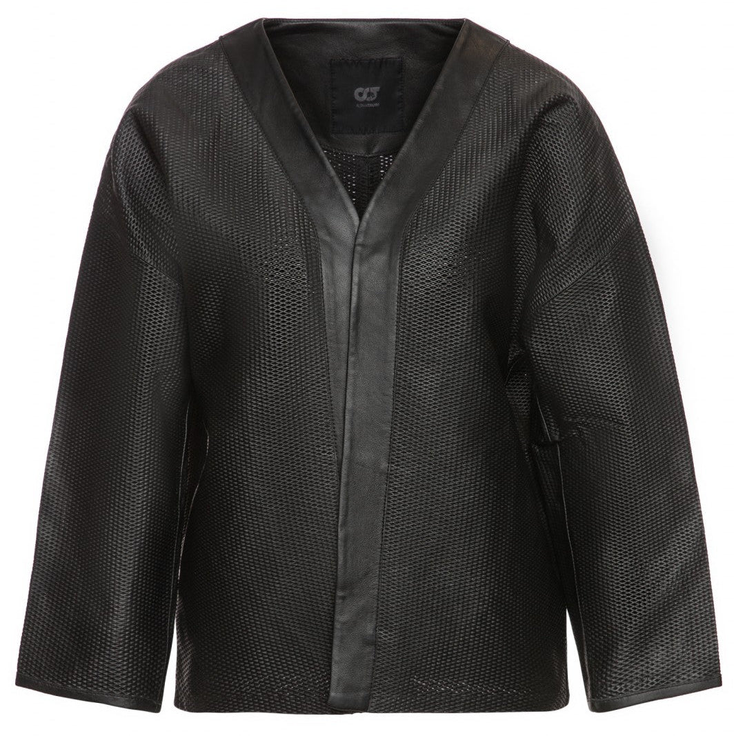 Stilinga ir lengva AlphaTauri odinė striukė moterims, pagaminta iš perforuotos natūralios odos, užtikrinančios geresnį kvėpavimą ir komfortą. Laisvo (relaxed) silueto, su V formos iškirpte ir atviru dizainu, ši striukė puikiai tinka tiek kasdienai, tiek išskirtinėms progoms. Juoda spalva ir minimalistinės linijos suteikia universalumo bei prabangos įspūdį.