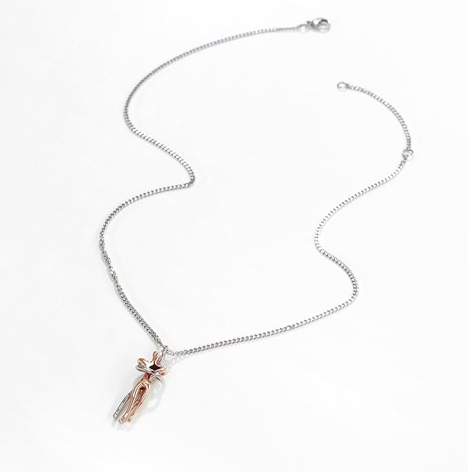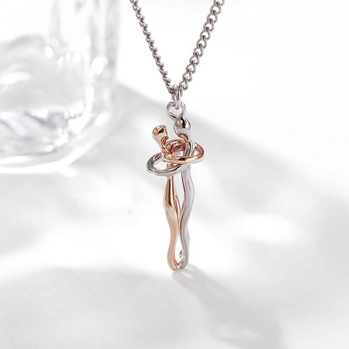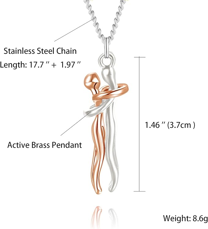 Elegantiška moteriška kaklo grandinėlė su pakabuku vaizduoja švelnų vyro ir moters apkabinimą – tai meilės, šilumos ir ryšio tarp dviejų žmonių simbolis. Puikiai tinka kaip poros kaklo papuošalas, išreiškiantis jausmus ypatingam žmogui.