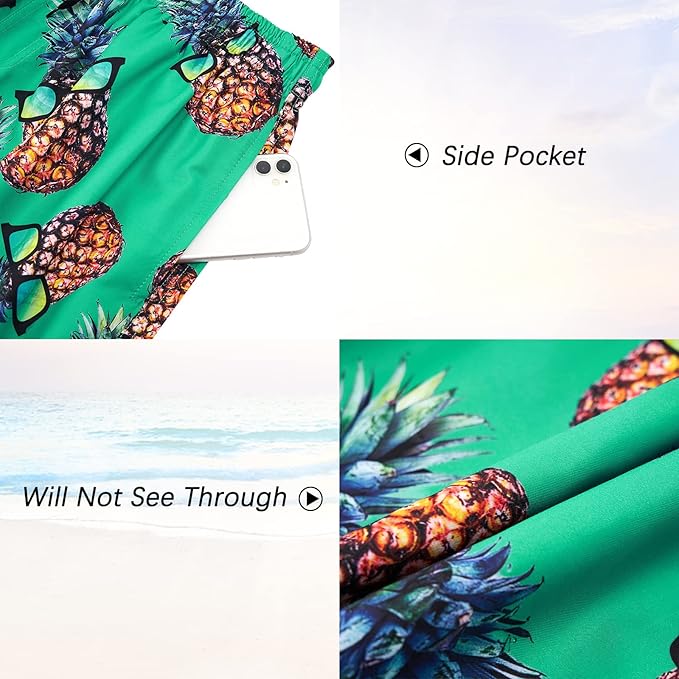 Linksmo dizaino vyriškos maudymosi kelnaitės su žaismingais ananasais – puikus pasirinkimas vasarai, paplūdimiui ar baseinui. Žaismingas stilius leis išsiskirti ir suteiks geros nuotaikos.