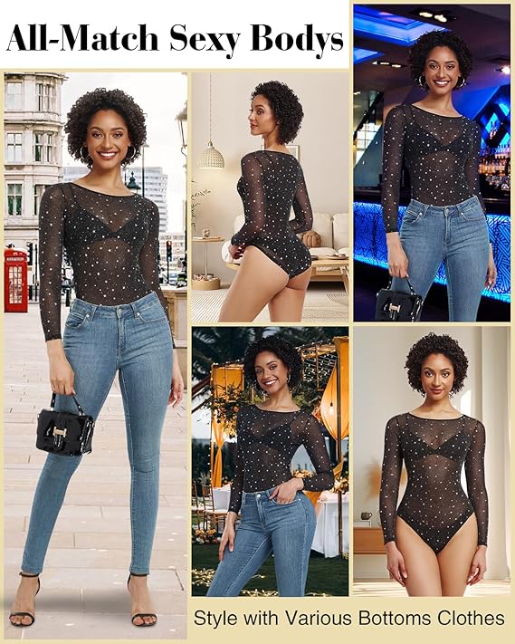 Atraskite stilingą ir drąsų pasirinkimą su WOWENY moteriškais permatomais bodis tipo topais. Šios bliuskutės pagamintos iš lengvos, kvėpuojančios tinklelio medžiagos, todėl puikiai tinka vakarėliams, klubams, pasimatymams ar festivalinėms aprangoms. Ilgos rankovės ir kūną prigludęs siluetas pabrėžia figūrą, o permatomas dizainas suteikia seksualumo ir elegancijos pojūtį.