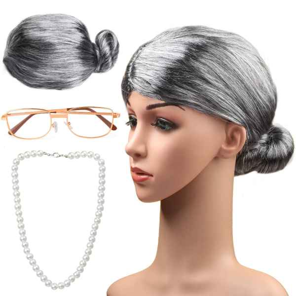 Senukės pilkų plaukų peruko rinkinys, kuriame yra perukas, akiniai ir perliniai karoliai, puikiai tiks kuriant žaismingą ir komišką įvaizdį. Idealu kostiumų vakarėliams ar teminiams renginiams!