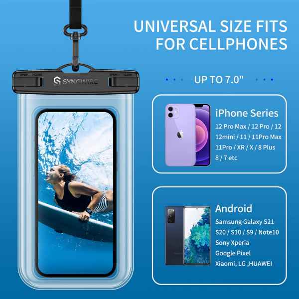 Vandeniui atsparūs telefono dėklai (2 vnt.) yra universalūs ir tinka daugeliui telefonų modelių, užtikrindami jų apsaugą nuo vandens, dulkių ir smėlio. Puikiai tinka naudoti atostogaujant, plaukiojant ar esant gamtoje.