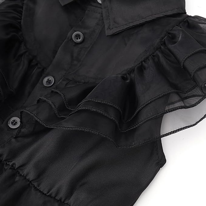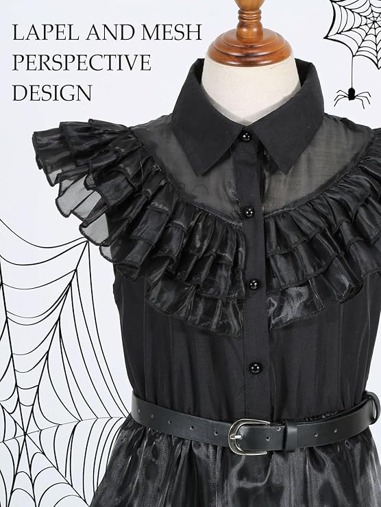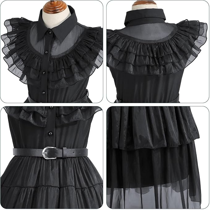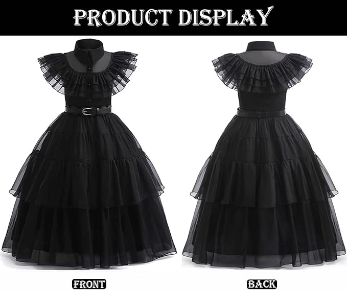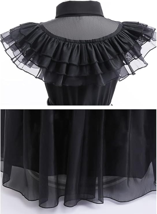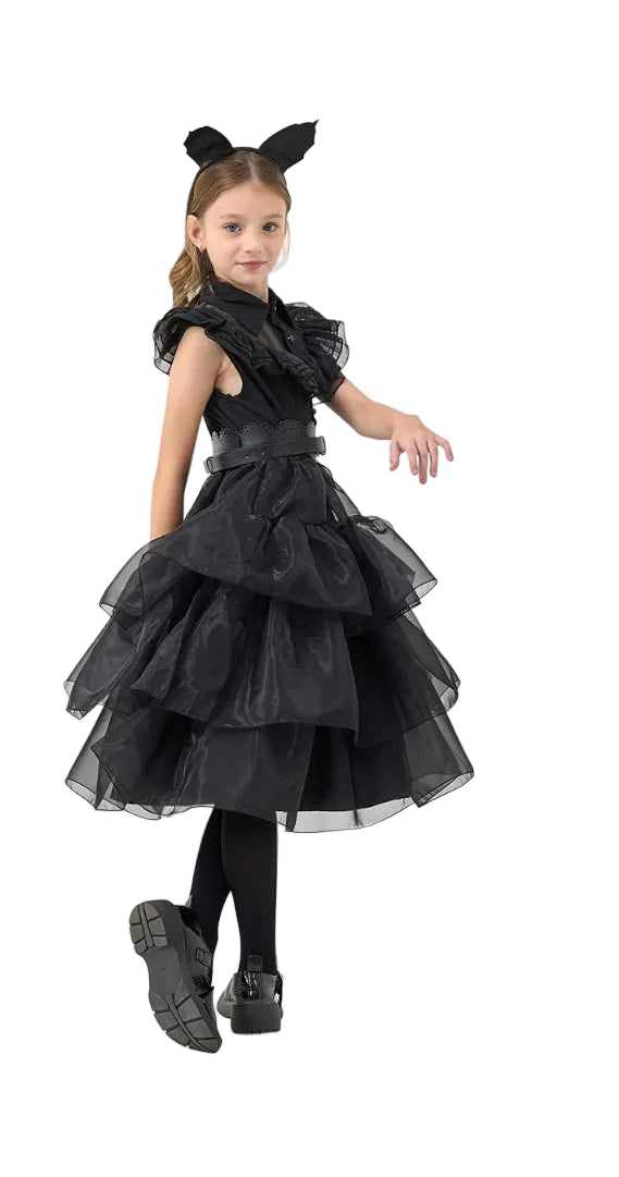 Juoda Wednesday įkvėpta suknelė mergaitėms – puikus pasirinkimas Helovinui, teminiams vakarėliams, cosplay, mokyklos renginiams ar fotosesijoms. Klasikinis gotikinis dizainas atkartoja populiaraus personažo stilių ir leidžia sukurti išskirtinį įvaizdį.